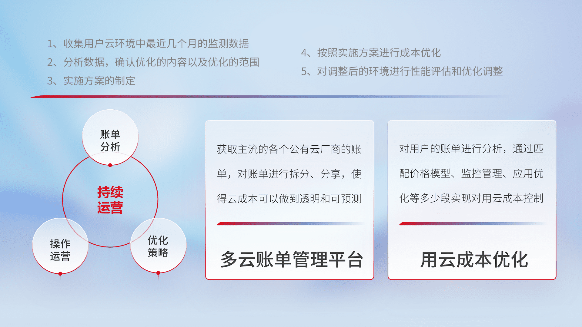通过多云纳管,,,,以统一的资源数据模型把客户的云资源进行抽象和封装,,,,进而实现对多云资源的统一操作,,,保障云资源管理的可靠性、、、稳定性与可用性。。。量身定制化运维内容,,配置、、、开发运维、、、、补丁管理、、、备份、、、、监控、、、、认证和访问管理、、审计和日常巡检等,,保障在用云过程中的可靠度,,,,稳定度以及高可用率。。。